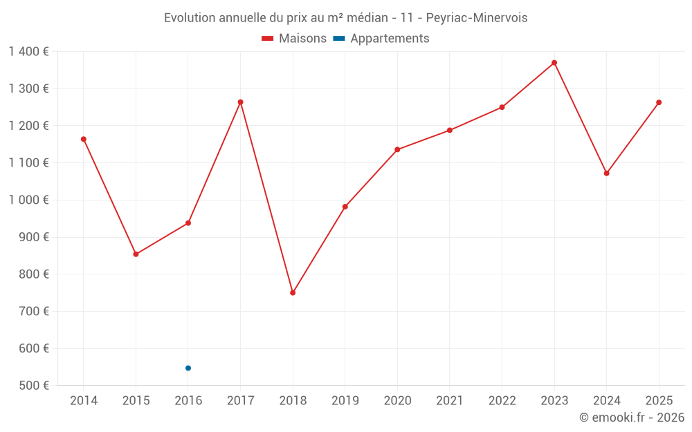 Le prix médian sur les 17 transactions de maisons des 12 derniers mois dans la commune de Peyriac-Minervois était de 1 419 € par mètre carré pour une valeur foncière médiane de 105 350 €. Sur cette période 60% des transactions se sont situées entre 453 et 2 171 € par mètre carré (du 2ème au 8ème déciles).