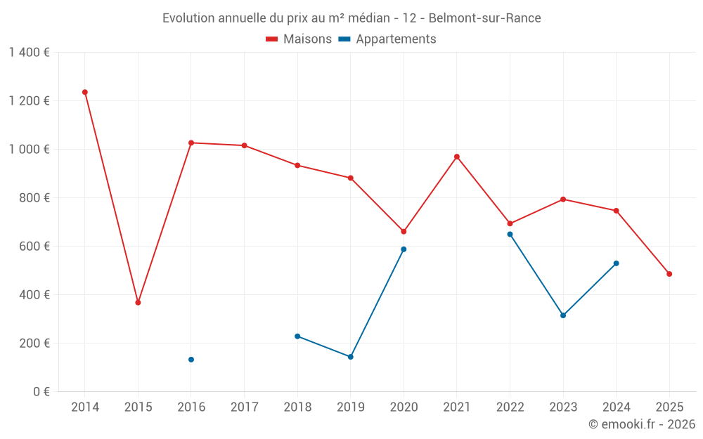 Le prix médian sur les 16 transactions de maisons des 24 derniers mois dans la commune de Belmont-sur-Rance était de 690 € par mètre carré pour une valeur foncière médiane de 77 500 €. Sur cette période 60% des transactions se sont situées entre 472 et 1 135 € par mètre carré (du 2ème au 8ème déciles).