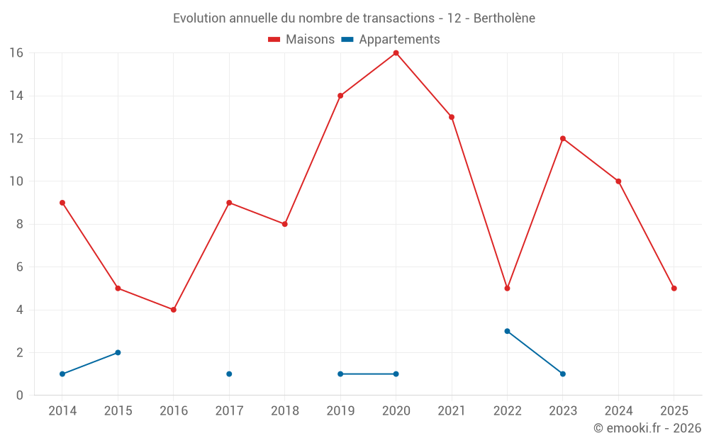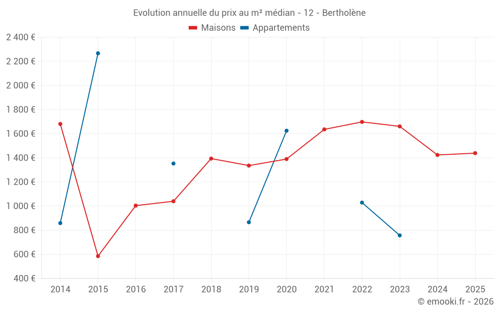 Le prix médian sur les 22 transactions de maisons des 24 derniers mois dans la commune de Bertholène était de 1 352 € par mètre carré pour une valeur foncière médiane de 156 500 €. Sur cette période 60% des transactions se sont situées entre 776 et 1 773 € par mètre carré (du 2ème au 8ème déciles).