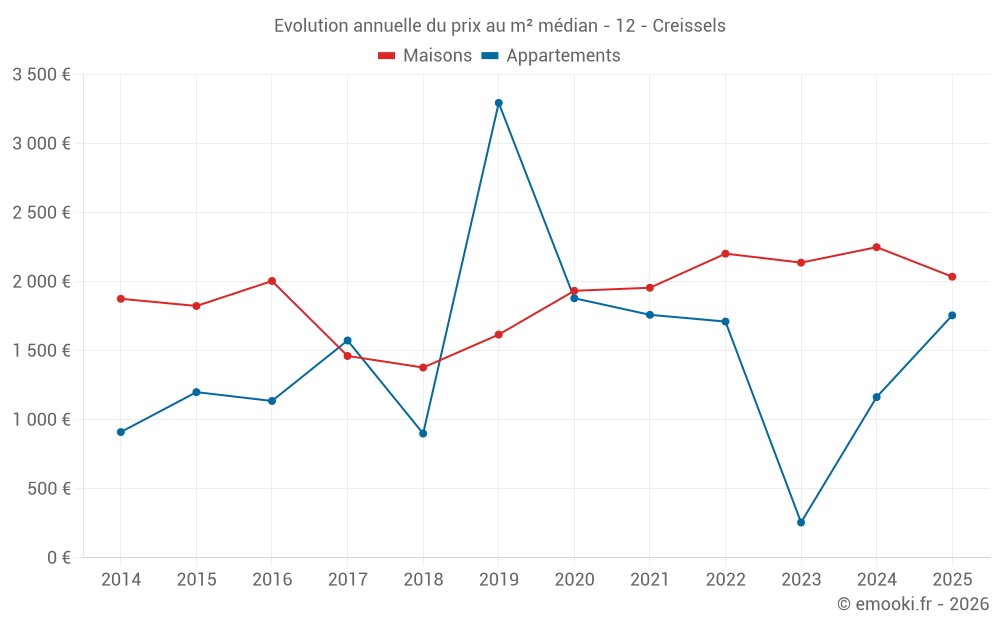 Le prix médian sur les 18 transactions de maisons des 24 derniers mois dans la commune de Creissels était de 2 212 € par mètre carré pour une valeur foncière médiane de 194 435 €. Sur cette période 60% des transactions se sont situées entre 1 766 et 2 546 € par mètre carré (du 2ème au 8ème déciles).