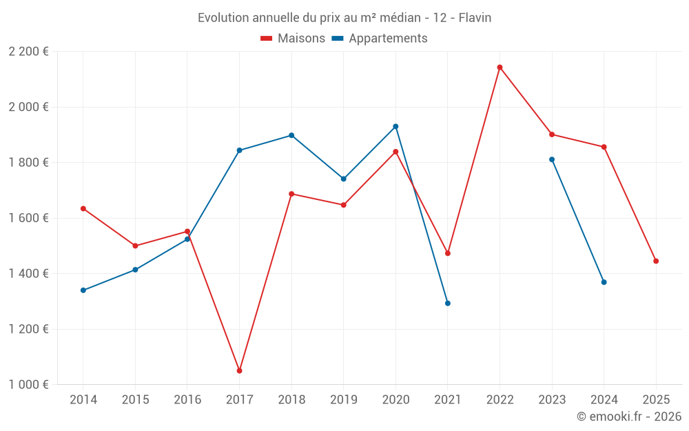 Le prix médian sur les 19 transactions de maisons des 12 derniers mois dans la commune de Flavin était de 1 408 € par mètre carré pour une valeur foncière médiane de 132 200 €. Sur cette période 60% des transactions se sont situées entre 746 et 2 455 € par mètre carré (du 2ème au 8ème déciles).