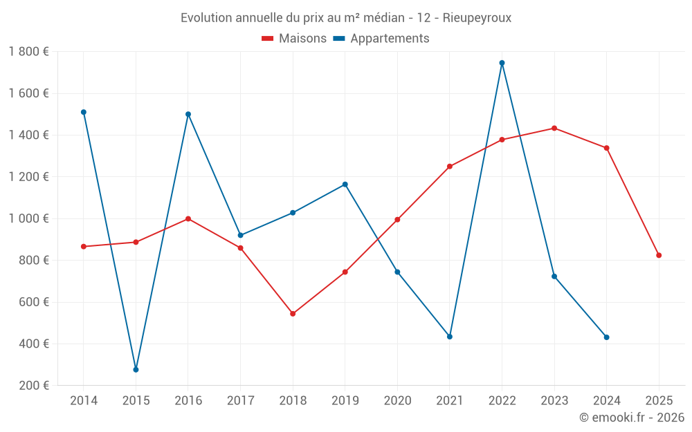Le prix médian sur les 16 transactions de maisons des 12 derniers mois dans la commune de Rieupeyroux était de 938 € par mètre carré pour une valeur foncière médiane de 97 950 €. Sur cette période 60% des transactions se sont situées entre 385 et 1 978 € par mètre carré (du 2ème au 8ème déciles).