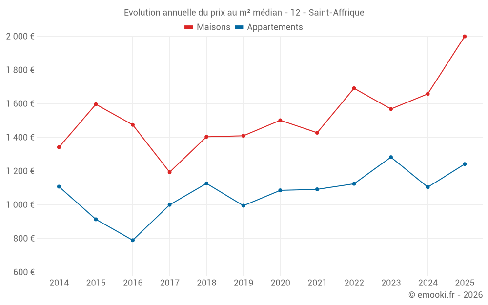 Le prix médian sur les 33 transactions de maisons des 6 derniers mois dans la commune de Saint-Affrique était de 2 000 € par mètre carré pour une valeur foncière médiane de 170 000 €. Sur cette période 60% des transactions se sont situées entre 1 154 et 2 461 € par mètre carré (du 2ème au 8ème déciles).