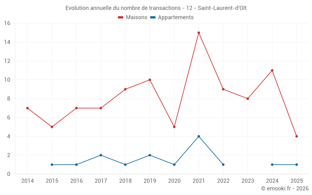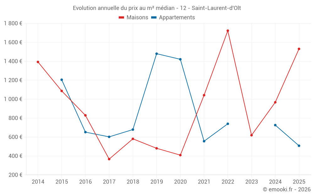 Le prix médian sur les 20 transactions de maisons des 24 derniers mois dans la commune de Saint-Laurent-d'Olt était de 854 € par mètre carré pour une valeur foncière médiane de 77 500 €. Sur cette période 60% des transactions se sont situées entre 426 et 1 930 € par mètre carré (du 2ème au 8ème déciles).