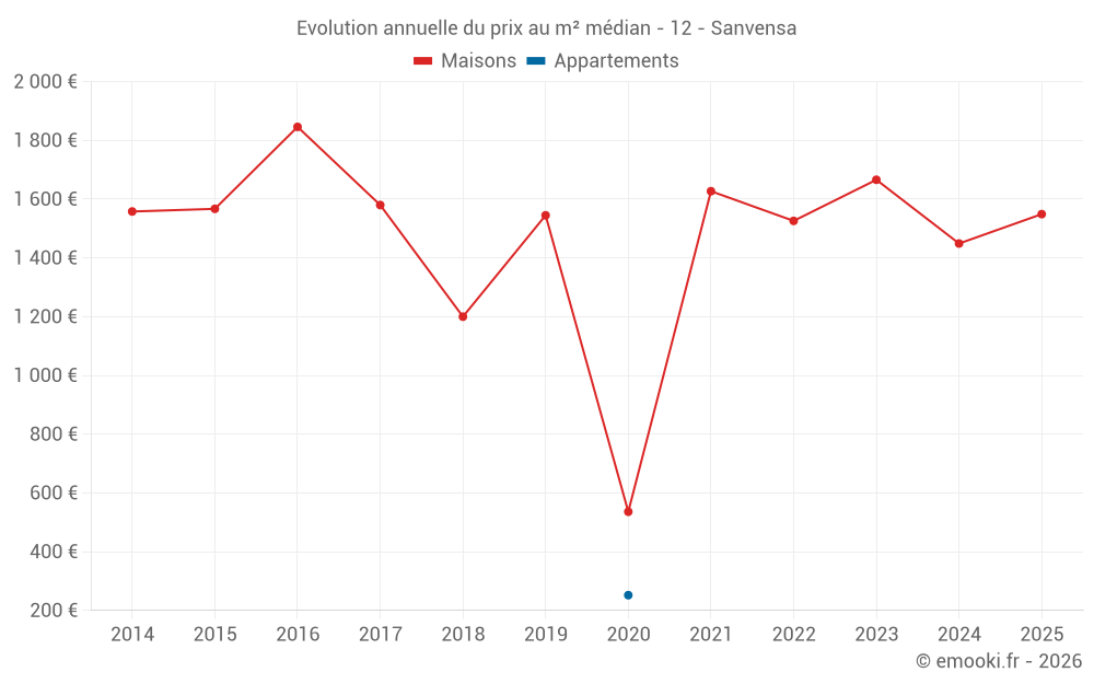 Le prix médian sur les 16 transactions de maisons des 24 derniers mois dans la commune de Sanvensa était de 1 588 € par mètre carré pour une valeur foncière médiane de 131 875 €. Sur cette période 60% des transactions se sont situées entre 1 042 et 2 027 € par mètre carré (du 2ème au 8ème déciles).