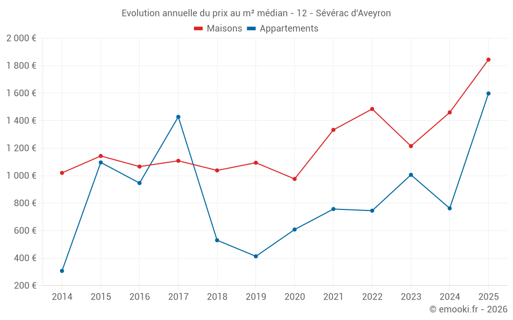 Le prix médian sur les 26 transactions de maisons des 6 derniers mois dans la commune de Sévérac d'Aveyron était de 1 844 € par mètre carré pour une valeur foncière médiane de 147 500 €. Sur cette période 60% des transactions se sont situées entre 1 000 et 2 154 € par mètre carré (du 2ème au 8ème déciles).