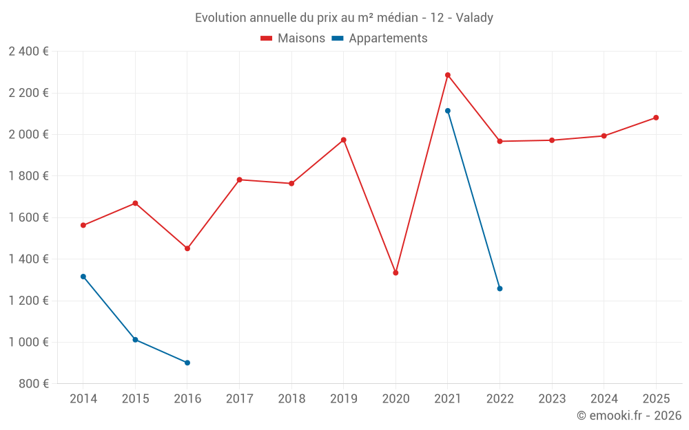 Le prix médian sur les 20 transactions de maisons des 12 derniers mois dans la commune de Valady était de 2 055 € par mètre carré pour une valeur foncière médiane de 178 100 €. Sur cette période 60% des transactions se sont situées entre 1 103 et 2 546 € par mètre carré (du 2ème au 8ème déciles).