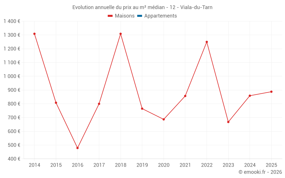 Le prix médian sur les 16 transactions de maisons des 24 derniers mois dans la commune de Viala-du-Tarn était de 868 € par mètre carré pour une valeur foncière médiane de 79 456 €. Sur cette période 60% des transactions se sont situées entre 556 et 1 750 € par mètre carré (du 2ème au 8ème déciles).