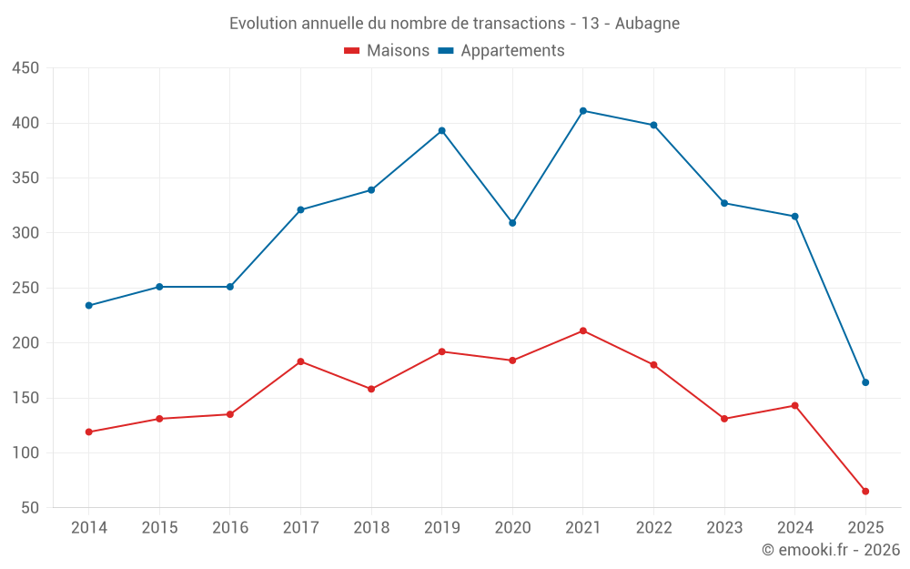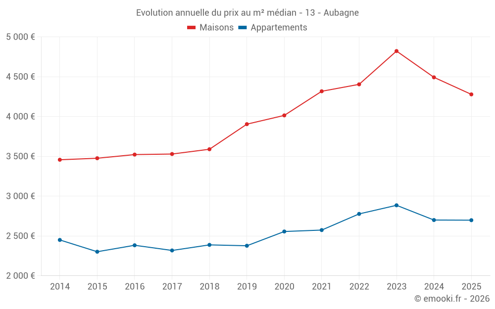 Le prix médian sur les 28 transactions de maisons des 3 derniers mois dans la commune d'Aubagne était de 4 170 € par mètre carré pour une valeur foncière médiane de 467 650 €. Sur cette période 60% des transactions se sont situées entre 3 165 et 5 494 € par mètre carré (du 2ème au 8ème déciles).