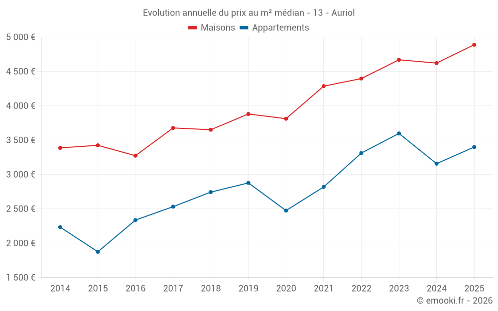 Le prix médian sur les 28 transactions de maisons des 6 derniers mois dans la commune d'Auriol était de 4 889 € par mètre carré pour une valeur foncière médiane de 432 460 €. Sur cette période 60% des transactions se sont situées entre 3 309 et 5 605 € par mètre carré (du 2ème au 8ème déciles).