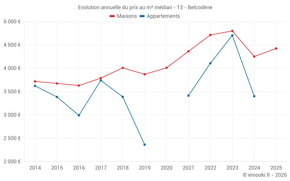 Le prix médian sur les 25 transactions de maisons des 24 derniers mois dans la commune de Belcodène était de 4 425 € par mètre carré pour une valeur foncière médiane de 490 000 €. Sur cette période 60% des transactions se sont situées entre 3 884 et 5 206 € par mètre carré (du 2ème au 8ème déciles).