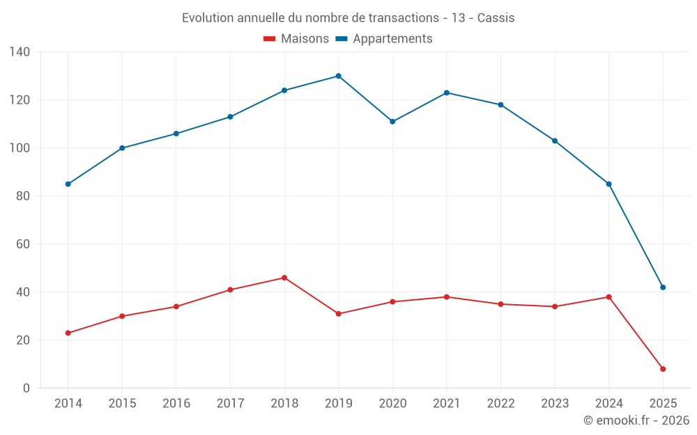 Le prix médian sur les 30 transactions de maisons des 12 derniers mois dans la commune de Cassis était de 9 500 € par mètre carré pour une valeur foncière médiane de 1 176 425 €. Sur cette période 60% des transactions se sont situées entre 5 085 et 11 593 € par mètre carré (du 2ème au 8ème déciles).