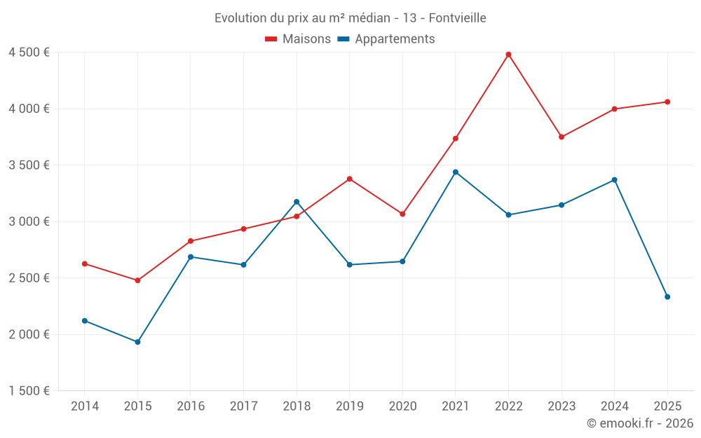 Le prix médian sur les 21 transactions de maisons des 6 derniers mois dans la commune de Fontvieille était de 4 061 € par mètre carré pour une valeur foncière médiane de 398 000 €. Sur cette période 60% des transactions se sont situées entre 3 000 et 5 000 € par mètre carré (du 2ème au 8ème déciles).