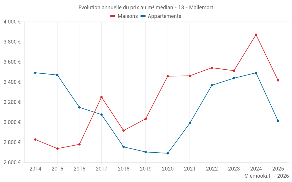 Le prix médian sur les 30 transactions de maisons des 6 derniers mois dans la commune de Mallemort était de 3 417 € par mètre carré pour une valeur foncière médiane de 329 050 €. Sur cette période 60% des transactions se sont situées entre 2 866 et 5 600 € par mètre carré (du 2ème au 8ème déciles).
