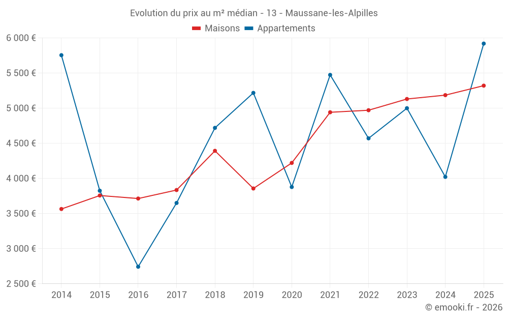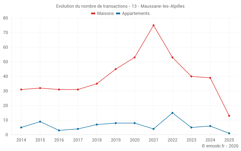 Le prix médian sur les 34 transactions de maisons des 12 derniers mois dans la commune de Maussane-les-Alpilles était de 5 478 € par mètre carré pour une valeur foncière médiane de 494 525 €. Sur cette période 60% des transactions se sont situées entre 4 135 et 8 414 € par mètre carré (du 2ème au 8ème déciles).