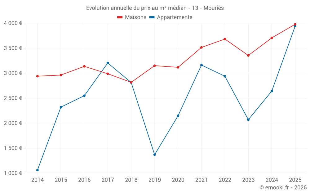 Le prix médian sur les 23 transactions de maisons des 6 derniers mois dans la commune de Mouriès était de 3 978 € par mètre carré pour une valeur foncière médiane de 346 770 €. Sur cette période 60% des transactions se sont situées entre 3 363 et 4 978 € par mètre carré (du 2ème au 8ème déciles).