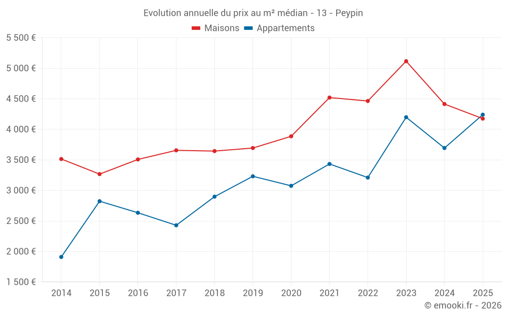 Le prix médian sur les 26 transactions de maisons des 6 derniers mois dans la commune de Peypin était de 4 175 € par mètre carré pour une valeur foncière médiane de 389 650 €. Sur cette période 60% des transactions se sont situées entre 3 675 et 4 664 € par mètre carré (du 2ème au 8ème déciles).