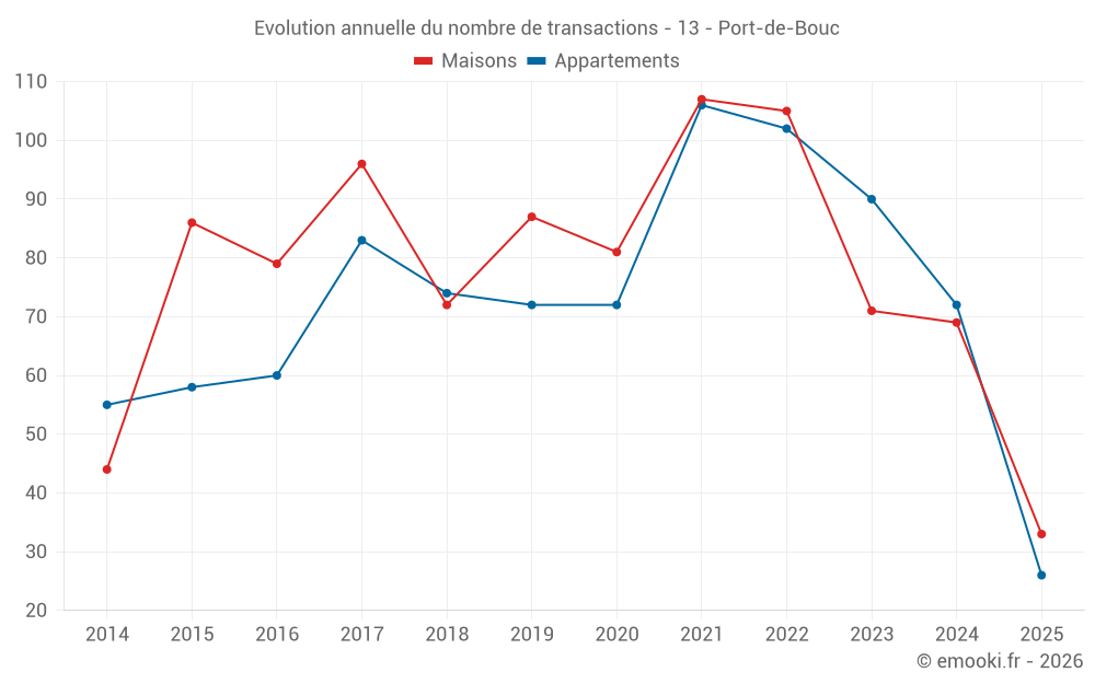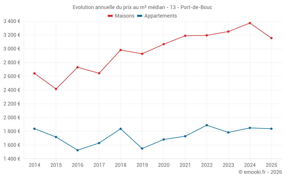 Le prix médian sur les 33 transactions de maisons des 6 derniers mois dans la commune de Port-de-Bouc était de 3 155 € par mètre carré pour une valeur foncière médiane de 245 000 €. Sur cette période 60% des transactions se sont situées entre 2 364 et 3 926 € par mètre carré (du 2ème au 8ème déciles).