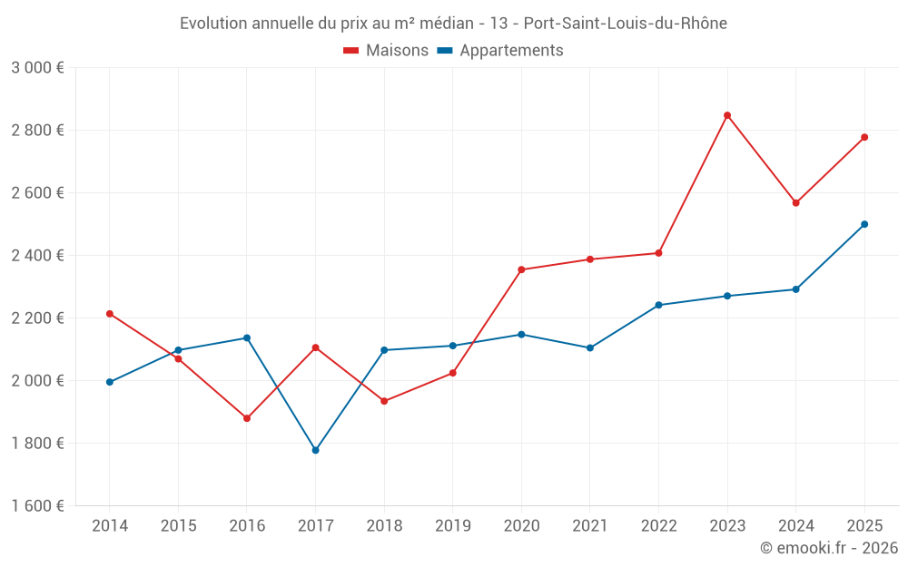Le prix médian sur les 32 transactions de maisons des 12 derniers mois dans la commune de Port-Saint-Louis-du-Rhône était de 2 652 € par mètre carré pour une valeur foncière médiane de 245 000 €. Sur cette période 60% des transactions se sont situées entre 2 002 et 3 134 € par mètre carré (du 2ème au 8ème déciles).
