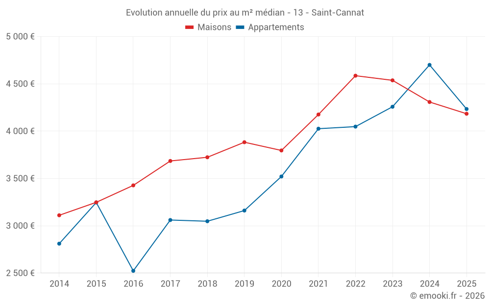 Le prix médian sur les 27 transactions de maisons des 6 derniers mois dans la commune de Saint-Cannat était de 4 184 € par mètre carré pour une valeur foncière médiane de 455 000 €. Sur cette période 60% des transactions se sont situées entre 3 273 et 4 981 € par mètre carré (du 2ème au 8ème déciles).