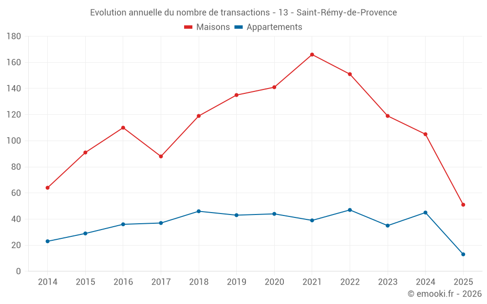 Le prix médian sur les 41 transactions d'appartements des 12 derniers mois dans la commune de Saint-Rémy-de-Provence était de 4 625 € par mètre carré pour une valeur foncière médiane de 230 000 €. Sur cette période 60% des transactions se sont situées entre 3 143 et 4 809 € par mètre carré (du 2ème au 8ème déciles).