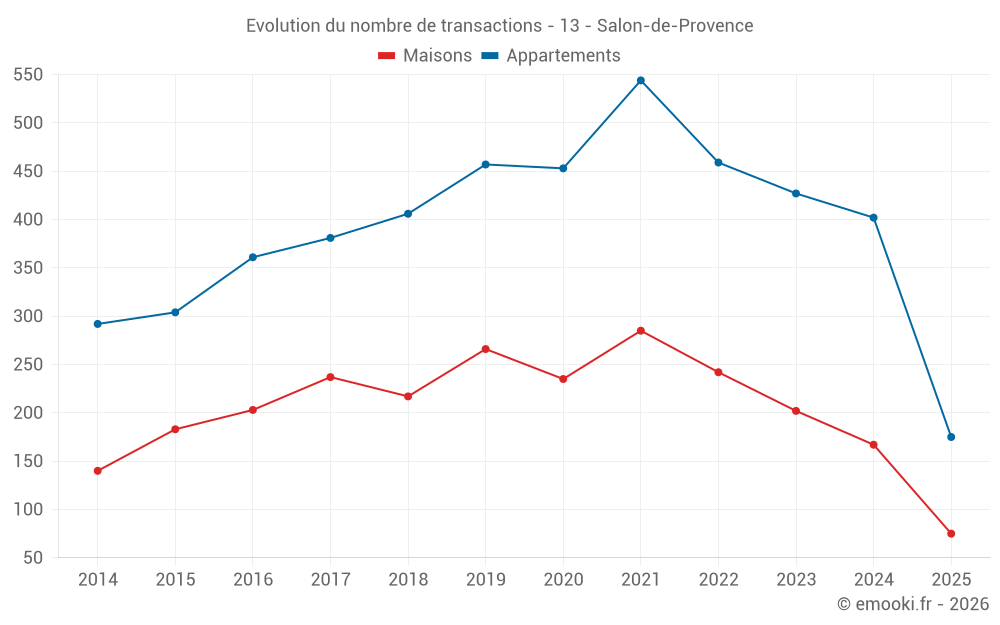 Le prix médian sur les 29 transactions de maisons des 3 derniers mois dans la commune de Salon-de-Provence était de 3 593 € par mètre carré pour une valeur foncière médiane de 355 700 €. Sur cette période 60% des transactions se sont situées entre 2 456 et 4 556 € par mètre carré (du 2ème au 8ème déciles).