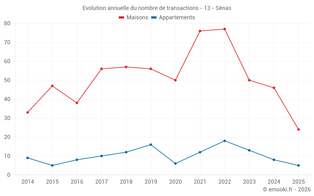 Le prix médian sur les 24 transactions de maisons des 6 derniers mois dans la commune de Sénas était de 3 319 € par mètre carré pour une valeur foncière médiane de 310 475 €. Sur cette période 60% des transactions se sont situées entre 2 834 et 3 678 € par mètre carré (du 2ème au 8ème déciles).