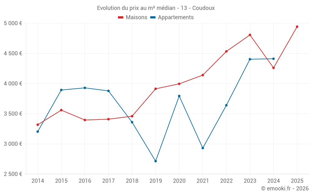 Le prix médian sur les 24 transactions de maisons des 12 derniers mois dans la commune de Coudoux était de 4 580 € par mètre carré pour une valeur foncière médiane de 416 000 €. Sur cette période 60% des transactions se sont situées entre 4 171 et 5 549 € par mètre carré (du 2ème au 8ème déciles).