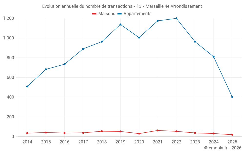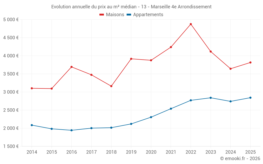 Le prix médian sur les 19 transactions de maisons des 6 derniers mois dans la commune de Marseille 4e Arrondissement était de 3 816 € par mètre carré pour une valeur foncière médiane de 329 000 €. Sur cette période 60% des transactions se sont situées entre 2 445 et 5 397 € par mètre carré (du 2ème au 8ème déciles).