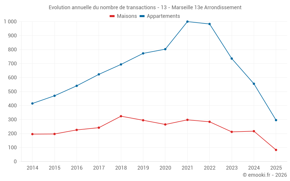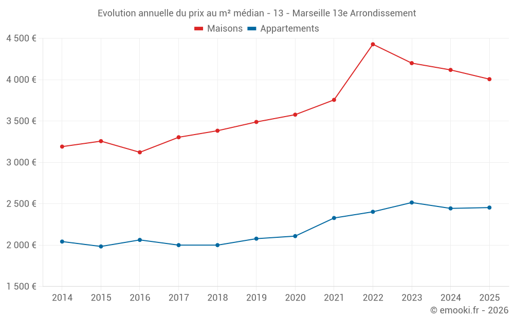 Le prix médian sur les 36 transactions de maisons des 3 derniers mois dans la commune de Marseille 13e Arrondissement était de 4 165 € par mètre carré pour une valeur foncière médiane de 302 500 €. Sur cette période 60% des transactions se sont situées entre 3 077 et 5 015 € par mètre carré (du 2ème au 8ème déciles).