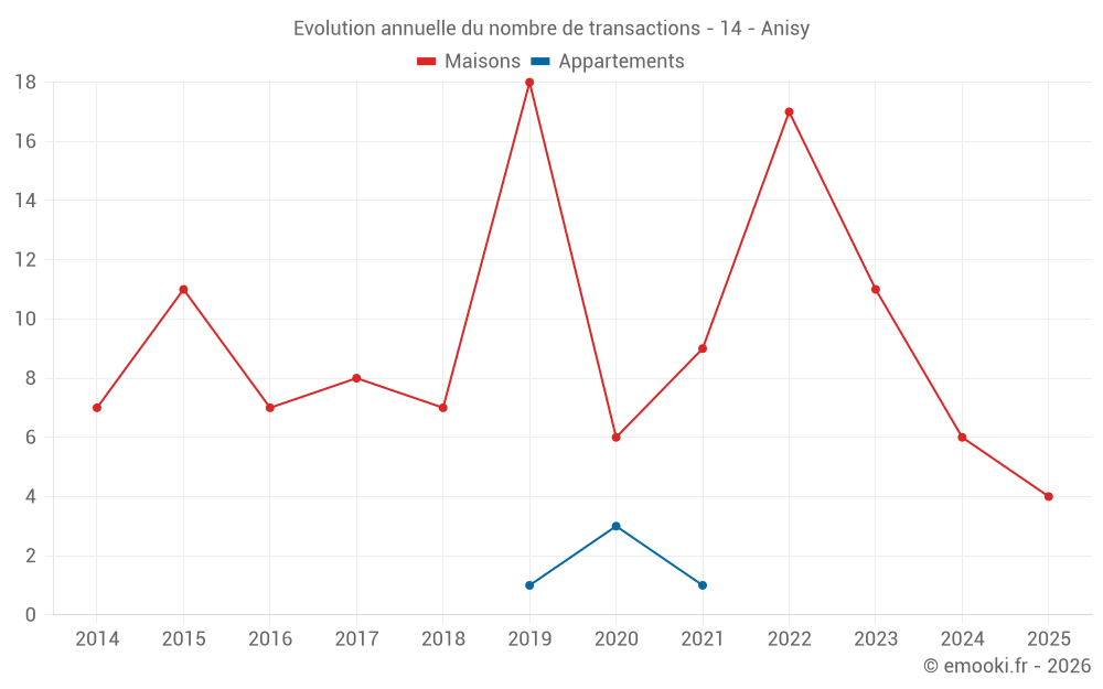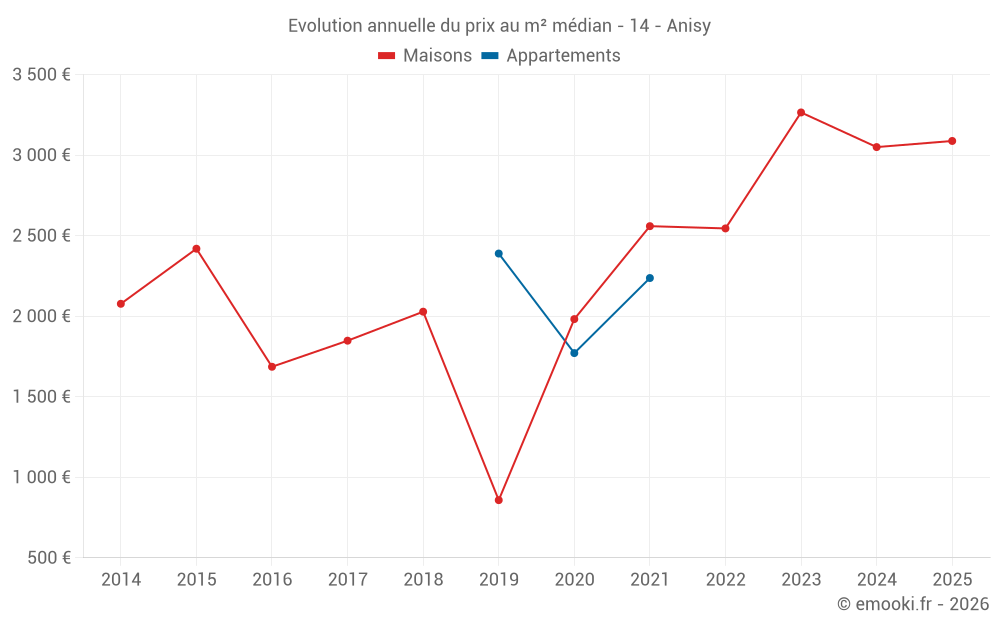 Le prix médian sur les 14 transactions de maisons des 24 derniers mois dans la commune d'Anisy était de 3 282 € par mètre carré pour une valeur foncière médiane de 429 025 €. Sur cette période 60% des transactions se sont situées entre 2 649 et 3 774 € par mètre carré (du 2ème au 8ème déciles).