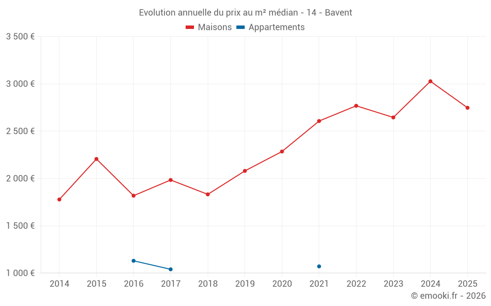 Le prix médian sur les 24 transactions de maisons des 12 derniers mois dans la commune de Bavent était de 2 774 € par mètre carré pour une valeur foncière médiane de 281 010 €. Sur cette période 60% des transactions se sont situées entre 2 134 et 3 326 € par mètre carré (du 2ème au 8ème déciles).