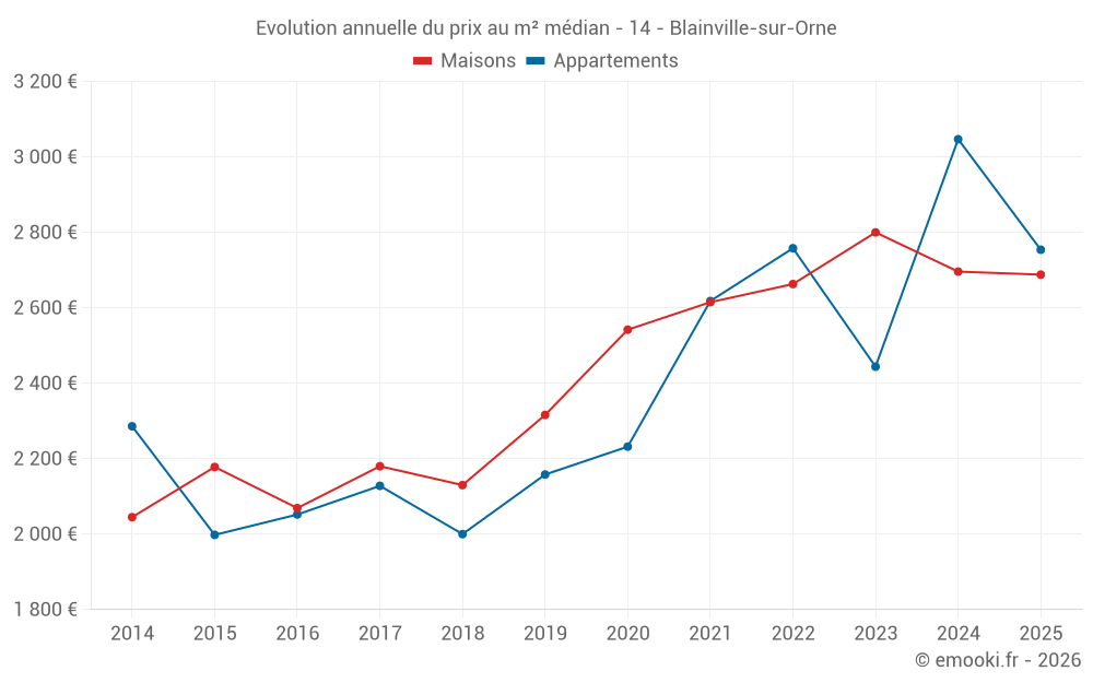 Le prix médian sur les 26 transactions de maisons des 12 derniers mois dans la commune de Blainville-sur-Orne était de 2 736 € par mètre carré pour une valeur foncière médiane de 245 000 €. Sur cette période 60% des transactions se sont situées entre 2 376 et 3 210 € par mètre carré (du 2ème au 8ème déciles).