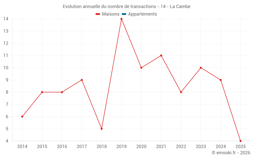 Le prix médian sur les 18 transactions de maisons des 24 derniers mois dans la commune de la Cambe était de 1 176 € par mètre carré pour une valeur foncière médiane de 98 500 €. Sur cette période 60% des transactions se sont situées entre 700 et 1 819 € par mètre carré (du 2ème au 8ème déciles).