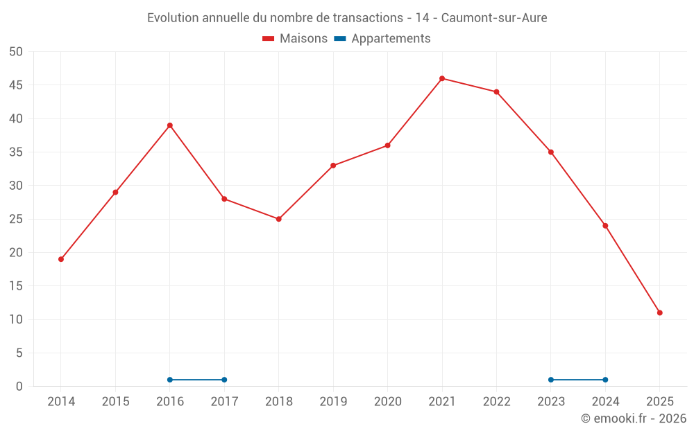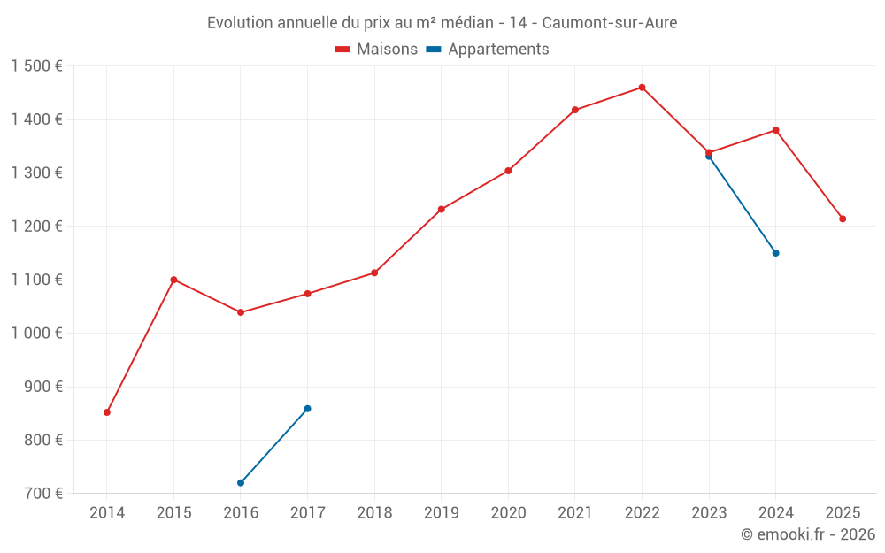 Le prix médian sur les 29 transactions de maisons des 12 derniers mois dans la commune de Caumont-sur-Aure était de 1 348 € par mètre carré pour une valeur foncière médiane de 119 680 €. Sur cette période 60% des transactions se sont situées entre 807 et 1 642 € par mètre carré (du 2ème au 8ème déciles).