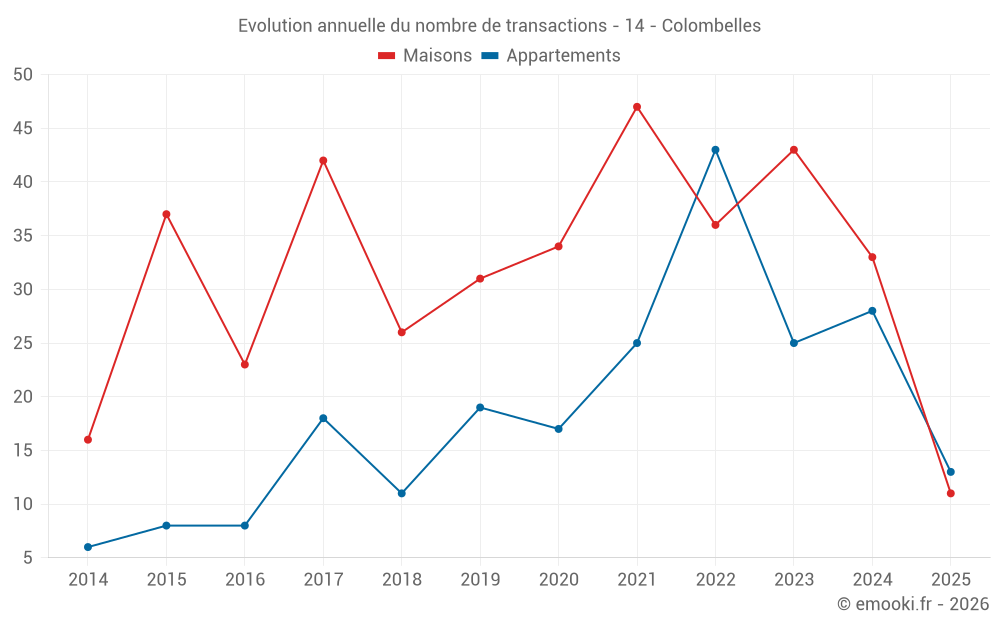 Le prix médian sur les 31 transactions d'appartements des 12 derniers mois dans la commune de Colombelles était de 2 822 € par mètre carré pour une valeur foncière médiane de 145 000 €. Sur cette période 60% des transactions se sont situées entre 2 419 et 3 223 € par mètre carré (du 2ème au 8ème déciles).