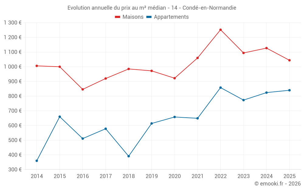 Le prix médian sur les 20 transactions d'appartements des 12 derniers mois dans la commune de Condé-en-Normandie était de 854 € par mètre carré pour une valeur foncière médiane de 55 540 €. Sur cette période 60% des transactions se sont situées entre 718 et 1 168 € par mètre carré (du 2ème au 8ème déciles).