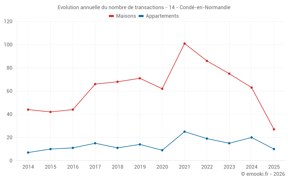 Le prix médian sur les 27 transactions de maisons des 6 derniers mois dans la commune de Condé-en-Normandie était de 1 044 € par mètre carré pour une valeur foncière médiane de 100 000 €. Sur cette période 60% des transactions se sont situées entre 602 et 1 537 € par mètre carré (du 2ème au 8ème déciles).