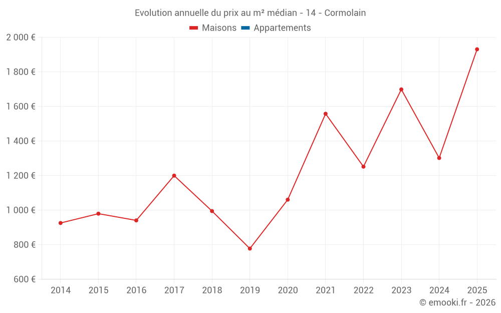 Le prix médian sur les 14 transactions de maisons des 24 derniers mois dans la commune de Cormolain était de 1 460 € par mètre carré pour une valeur foncière médiane de 127 140 €. Sur cette période 60% des transactions se sont situées entre 1 256 et 1 747 € par mètre carré (du 2ème au 8ème déciles).