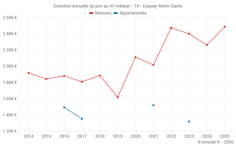 Le prix médian sur les 20 transactions de maisons des 24 derniers mois dans la commune d'Esquay-Notre-Dame était de 2 322 € par mètre carré pour une valeur foncière médiane de 234 750 €. Sur cette période 60% des transactions se sont situées entre 1 996 et 2 709 € par mètre carré (du 2ème au 8ème déciles).