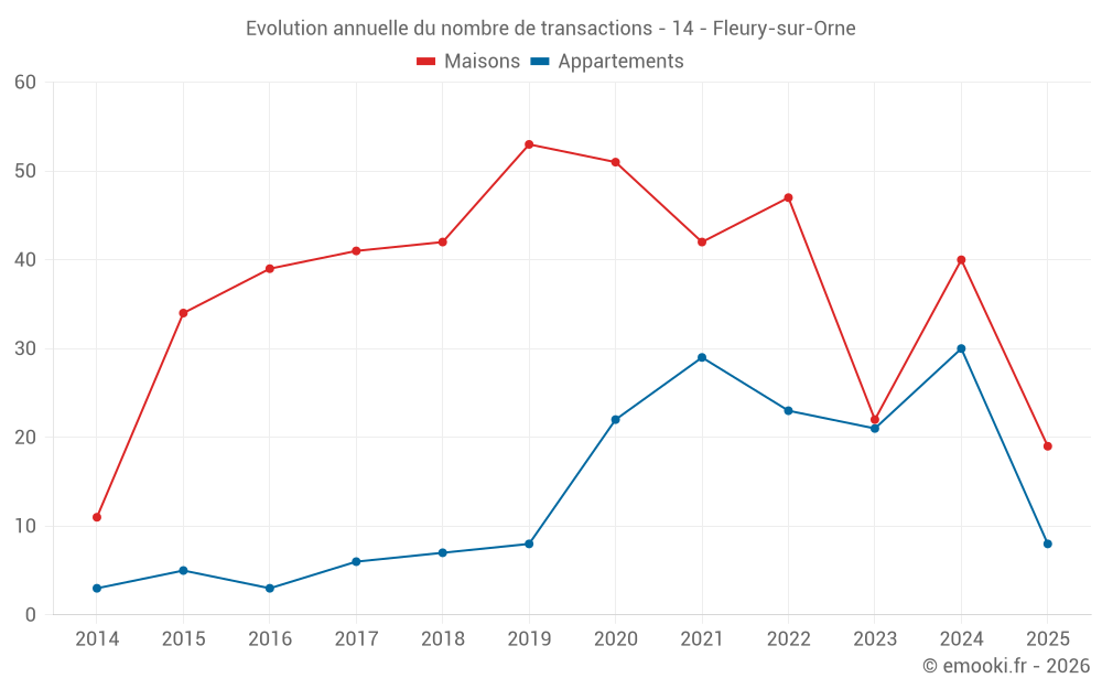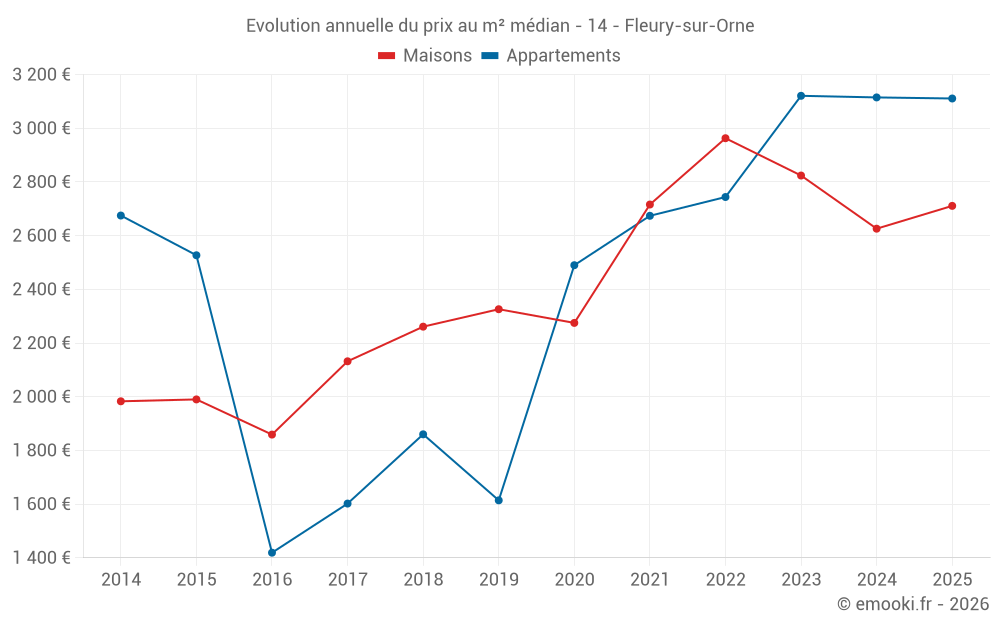 Le prix médian sur les 19 transactions de maisons des 6 derniers mois dans la commune de Fleury-sur-Orne était de 2 711 € par mètre carré pour une valeur foncière médiane de 223 830 €. Sur cette période 60% des transactions se sont situées entre 2 205 et 2 932 € par mètre carré (du 2ème au 8ème déciles).