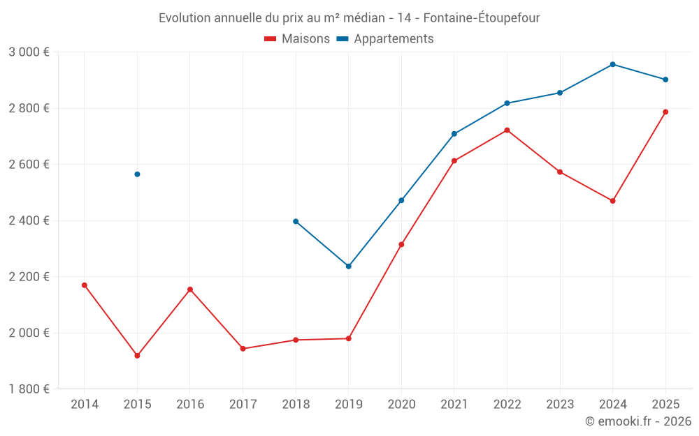 Le prix médian sur les 35 transactions de maisons des 24 derniers mois dans la commune de Fontaine-Étoupefour était de 2 541 € par mètre carré pour une valeur foncière médiane de 270 000 €. Sur cette période 60% des transactions se sont situées entre 1 923 et 2 851 € par mètre carré (du 2ème au 8ème déciles).