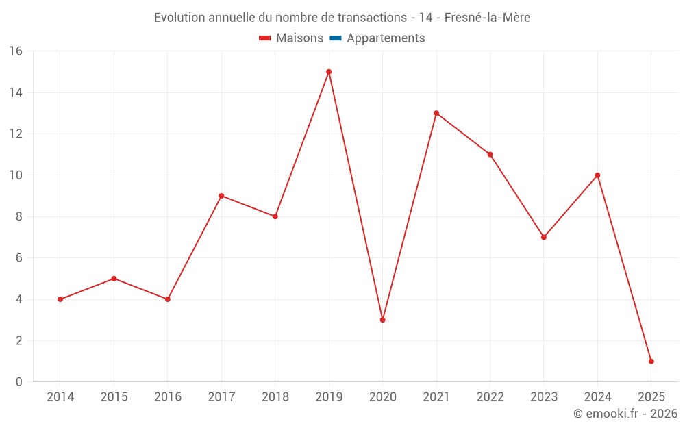 Le prix médian sur les 15 transactions de maisons des 24 derniers mois dans la commune de Fresné-la-Mère était de 1 536 € par mètre carré pour une valeur foncière médiane de 165 000 €. Sur cette période 60% des transactions se sont situées entre 1 196 et 2 018 € par mètre carré (du 2ème au 8ème déciles).