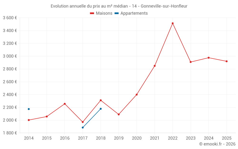 Le prix médian sur les 21 transactions de maisons des 24 derniers mois dans la commune de Gonneville-sur-Honfleur était de 2 982 € par mètre carré pour une valeur foncière médiane de 290 000 €. Sur cette période 60% des transactions se sont situées entre 2 364 et 3 529 € par mètre carré (du 2ème au 8ème déciles).