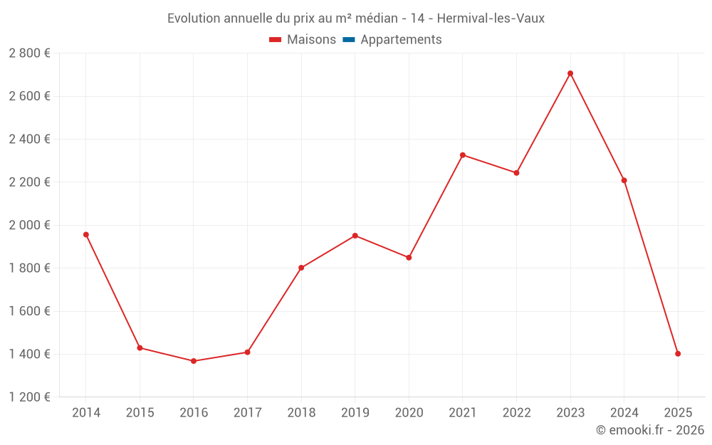Le prix médian sur les 16 transactions de maisons des 24 derniers mois dans la commune de Hermival-les-Vaux était de 2 227 € par mètre carré pour une valeur foncière médiane de 240 150 €. Sur cette période 60% des transactions se sont situées entre 1 866 et 3 148 € par mètre carré (du 2ème au 8ème déciles).