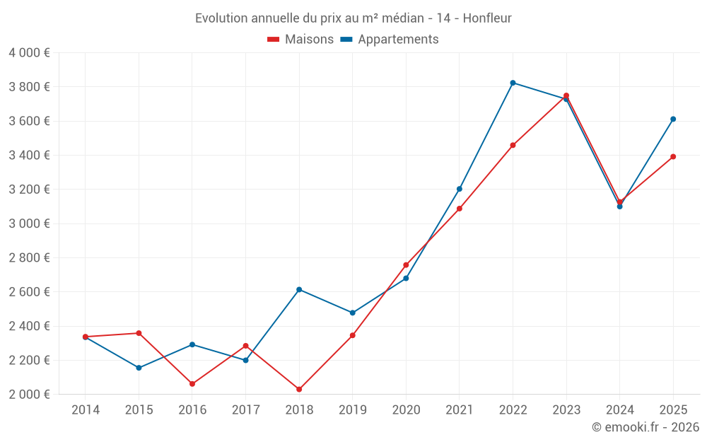 Le prix médian sur les 20 transactions de maisons des 6 derniers mois dans la commune de Honfleur était de 3 392 € par mètre carré pour une valeur foncière médiane de 287 083 €. Sur cette période 60% des transactions se sont situées entre 2 791 et 4 328 € par mètre carré (du 2ème au 8ème déciles).