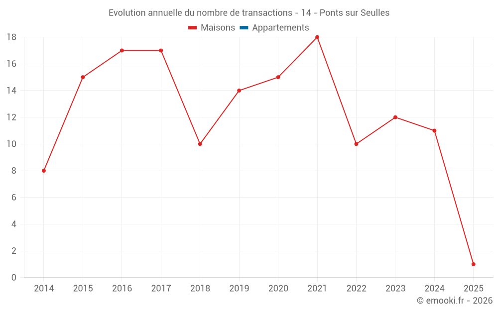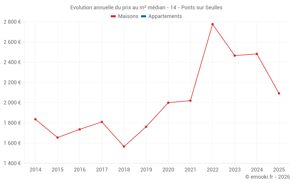 Le prix médian sur les 19 transactions de maisons des 24 derniers mois dans la commune de Ponts sur Seulles était de 2 383 € par mètre carré pour une valeur foncière médiane de 298 000 €. Sur cette période 60% des transactions se sont situées entre 1 971 et 2 801 € par mètre carré (du 2ème au 8ème déciles).
