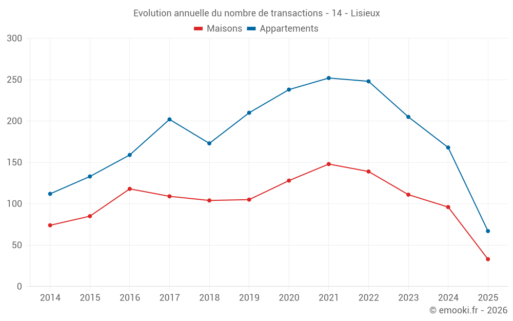 Le prix médian sur les 33 transactions de maisons des 6 derniers mois dans la commune de Lisieux était de 1 978 € par mètre carré pour une valeur foncière médiane de 172 000 €. Sur cette période 60% des transactions se sont situées entre 1 593 et 2 486 € par mètre carré (du 2ème au 8ème déciles).