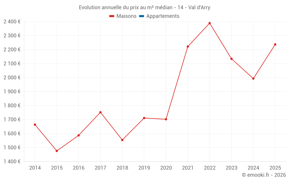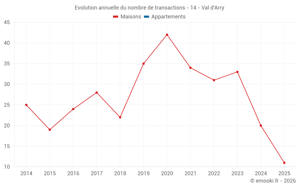 Le prix médian sur les 22 transactions de maisons des 12 derniers mois dans la commune de Val d'Arry était de 2 158 € par mètre carré pour une valeur foncière médiane de 209 900 €. Sur cette période 60% des transactions se sont situées entre 1 491 et 2 829 € par mètre carré (du 2ème au 8ème déciles).