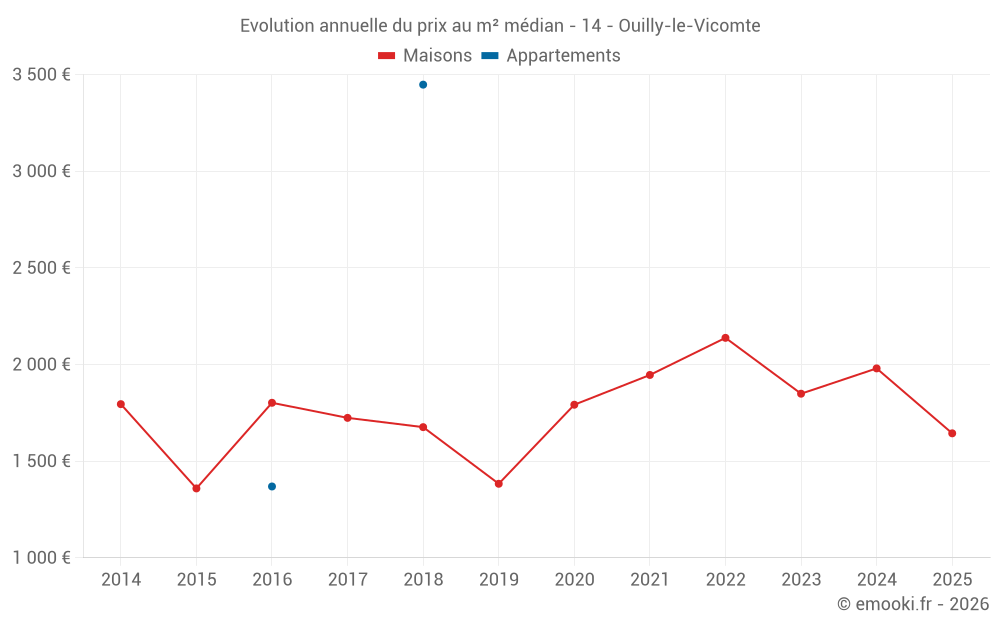 Le prix médian sur les 18 transactions de maisons des 24 derniers mois dans la commune d'Ouilly-le-Vicomte était de 1 941 € par mètre carré pour une valeur foncière médiane de 202 500 €. Sur cette période 60% des transactions se sont situées entre 1 559 et 2 292 € par mètre carré (du 2ème au 8ème déciles).
